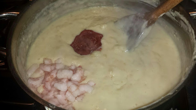 Mexa bem e adicione alternadamente a agua (ou o caldo da cozedura dos camaroes) e leite aos poucos,